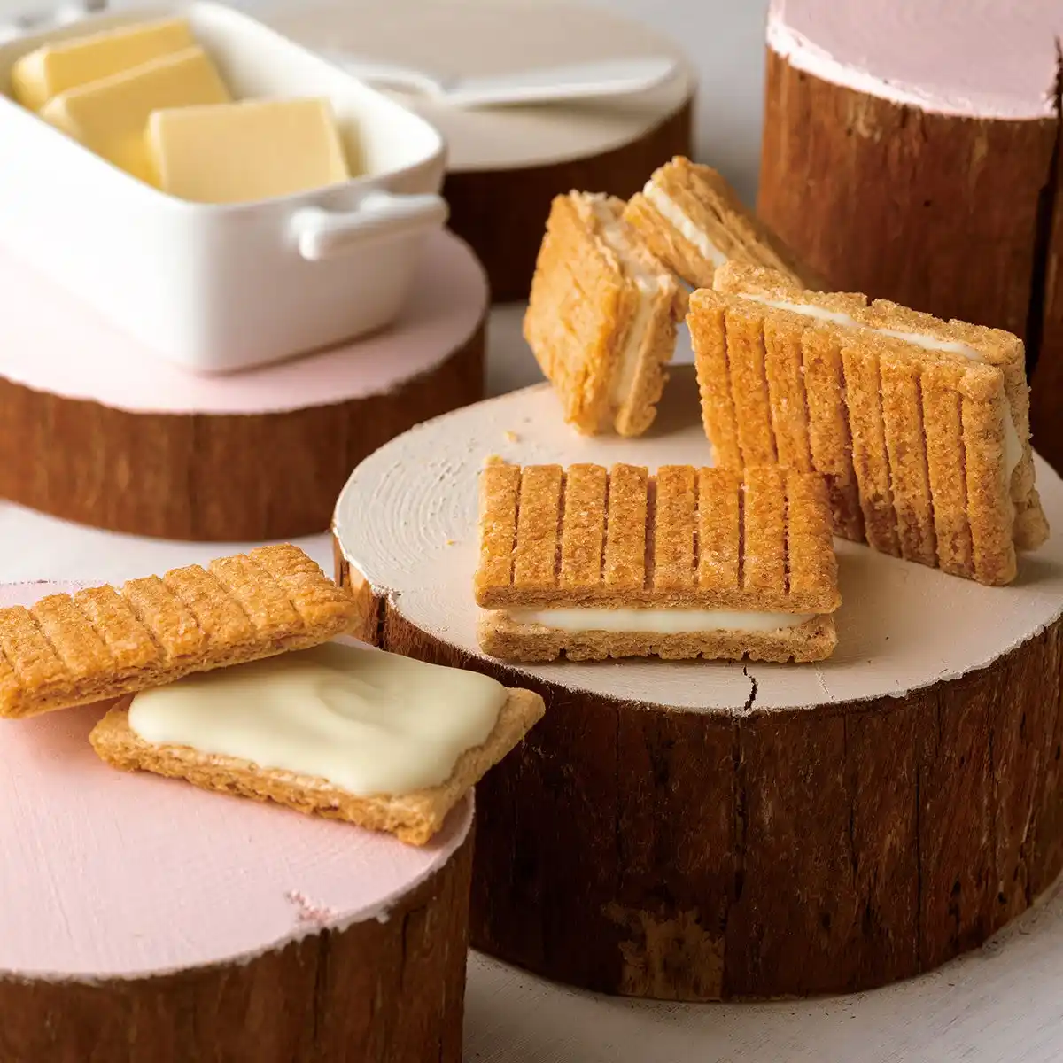 | シュガーバターでこんがり焼いたシリアル生地にホワイトショコラをサンド。 | |||