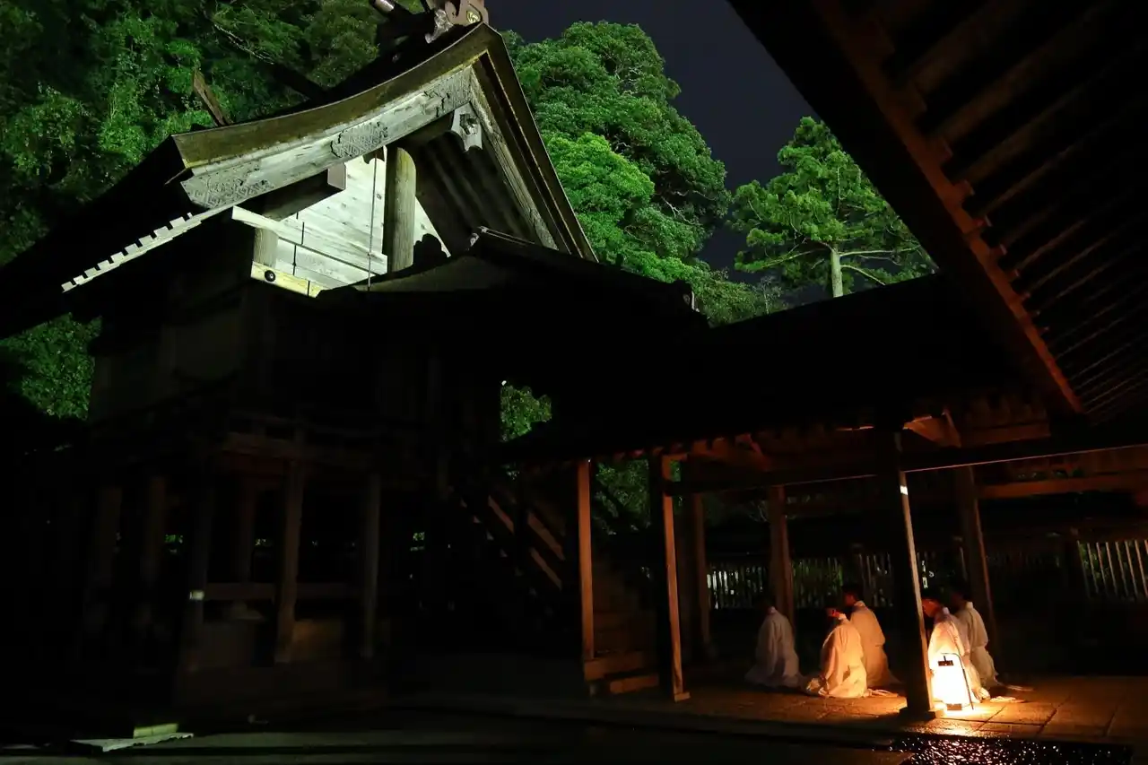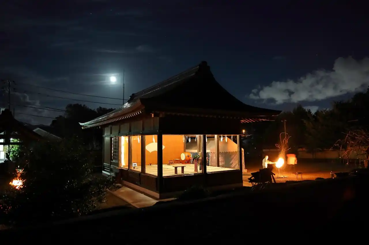 18:45 佐太神社到着・境内で静かに過ごす 夜の境内の空気を感じながら開演を待ちます。昼間とは異なる静けさが、これから始まる神事芸能へ向けて気持ちを整えてくれます。 |