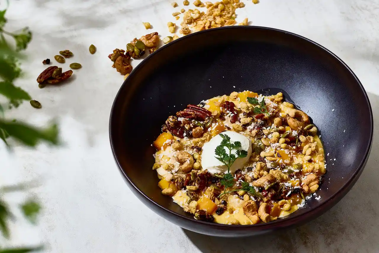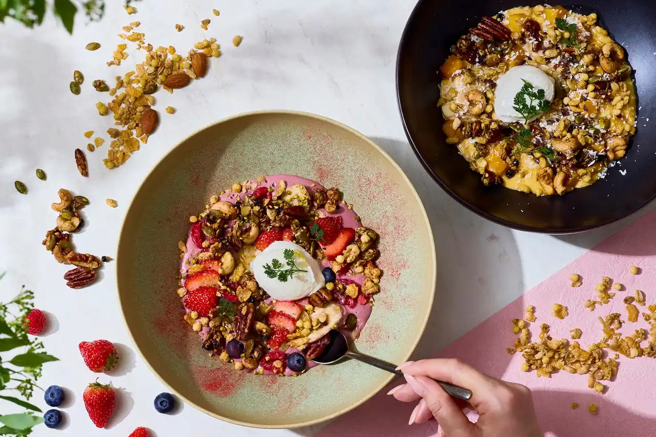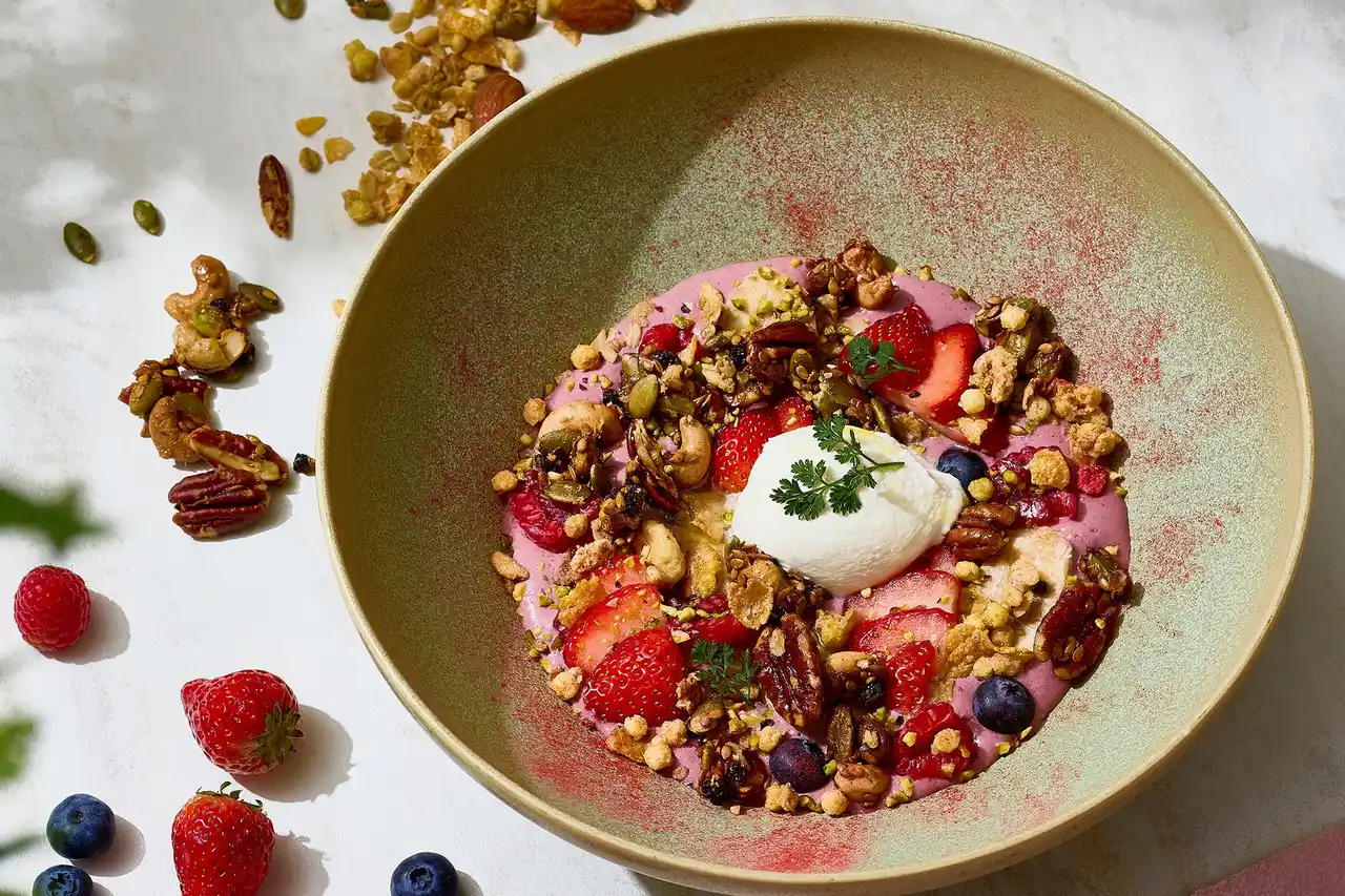 スーパーフードのアサイーとビタミン豊富ないちご、エネルギー源となるバナナと高タンパクなグリークヨーグルトを贅沢にミックスしたクリーミーな砂糖不使用のベース。その上には、ナッツやパンプキンシードなどのザクザクとした食感とローストされた香ばしさが広がる自家製スーパーフードグラノーラと、ほのかな甘みの小粒のグラノーラを敷き詰めました。フレッシュないちご、ブルーベリー、ラズベリー、バナナを彩り豊かに配し、仕上げには追いグリークヨーグルトを添えることで、最後の一口までより満足感のある「食べる美容液」のような一皿に仕上げています。 |