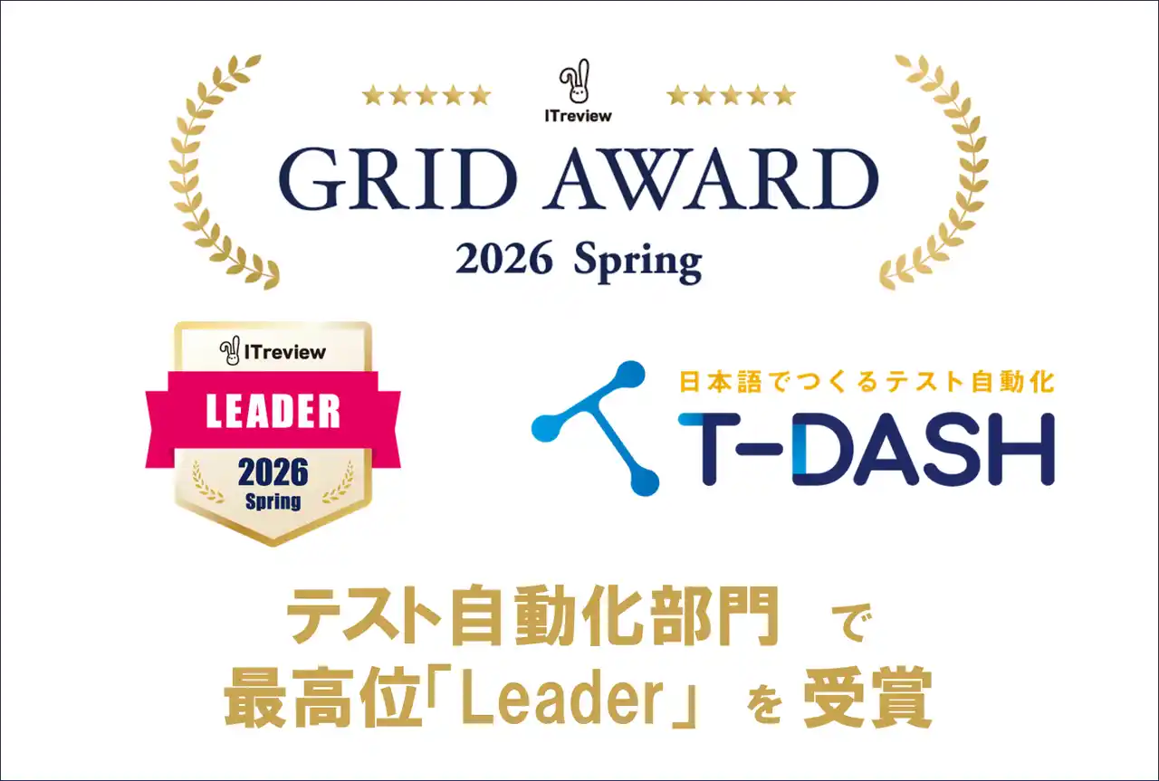 | バルテス・ホールディングス株式会社のグループ会社で、ソフトウェアテストおよび品質向上支援をおこなうバルテス株式会社(本社:大阪市西区、東京都千代田区、代表取締役社長:田邊浩一、以下、バルテス)が提供するテスト自動化ツール「T-DASH(ティーダッシュ)」は、2026年4月15日(水)、アイティクラウド株式会社が主催する「ITreview Grid Award 2026 Spring」の「テスト自動化ツール部門」において、最高位である「Leader」を受賞いたしました。 | |||||||||