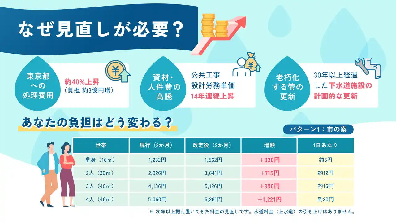 こうした状況から、日野市では2027年4月に平均約25%増の下水道使用料見直しを行う方向で検討しています。 |