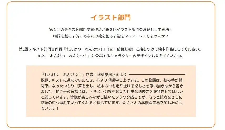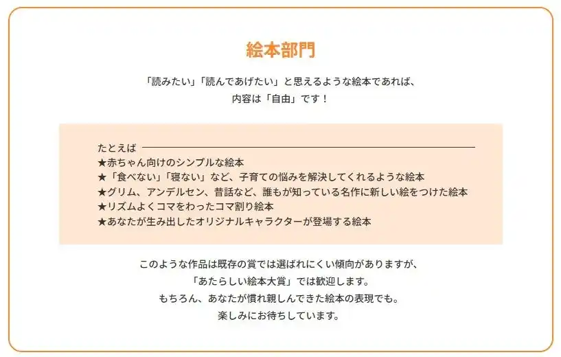 | 絵本部門:絵や文章を書くのが好きな人、物語を伝えたい人へ | |||