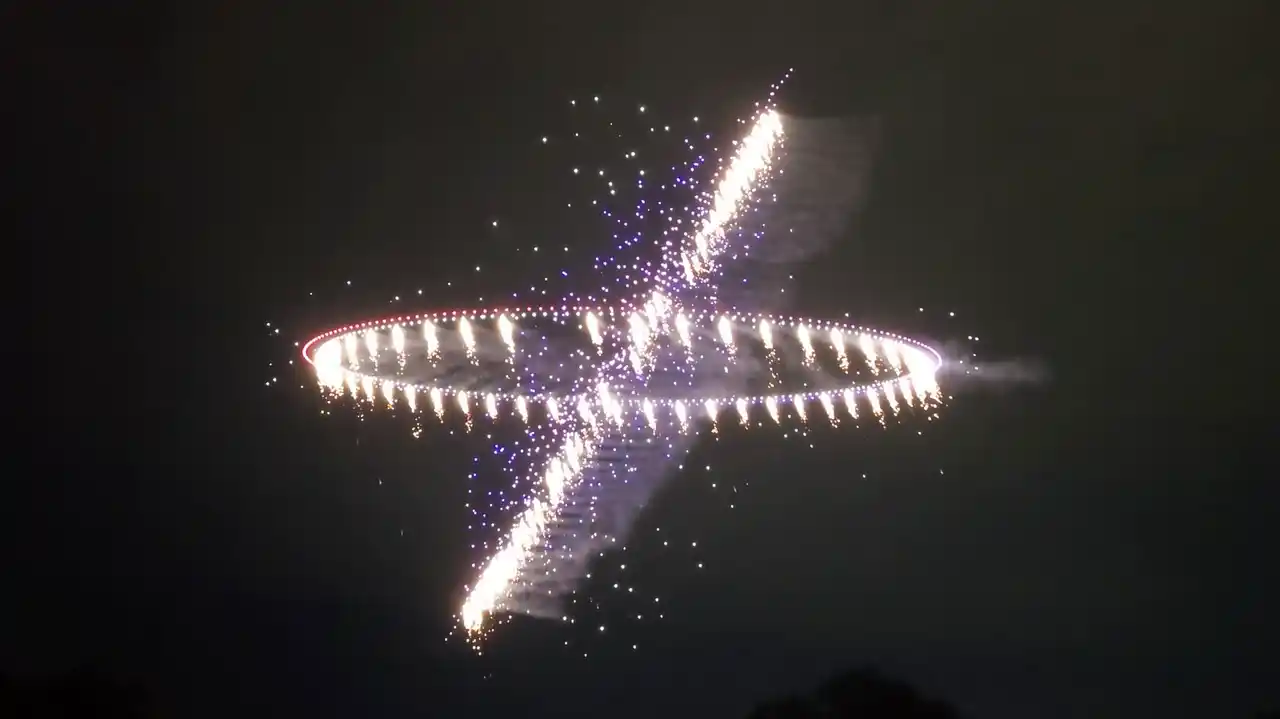 約14分にわたるショーでは、ドローンによる精密な光の演出に加え、従来のLEDライトの約6倍の輝度を持つフラッシュモジュールによる閃光、さらに花火を搭載したドローンによるダイナミックを組み合わせて実施しました。 |