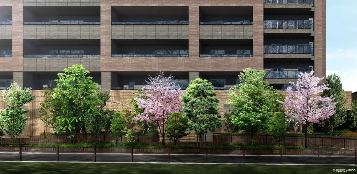 外観は、小田急線の旧電車基地跡地という“鉄道の記憶”から想起したレンガタイルをデザインの中心となる素材に採用しました。また、「経堂テラスガーデン」の“歩きたくなるまち・経堂”というコンセプトを継承し、グリーンプロムナードやユリの木通りと結ばれる遊歩道を敷地内に整備。目前に広がる山下公園と呼応するように、季節の移ろいが日々味わえる多様な樹々や花々の植栽を施し、街と一体になった新たな並木道を仕立てます。 |