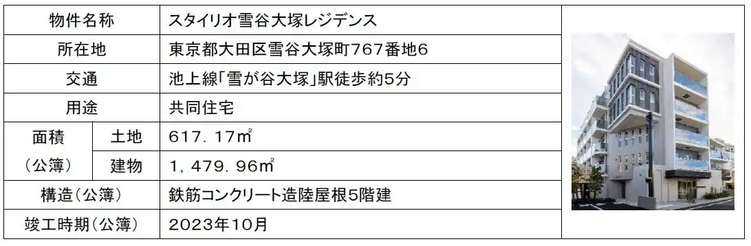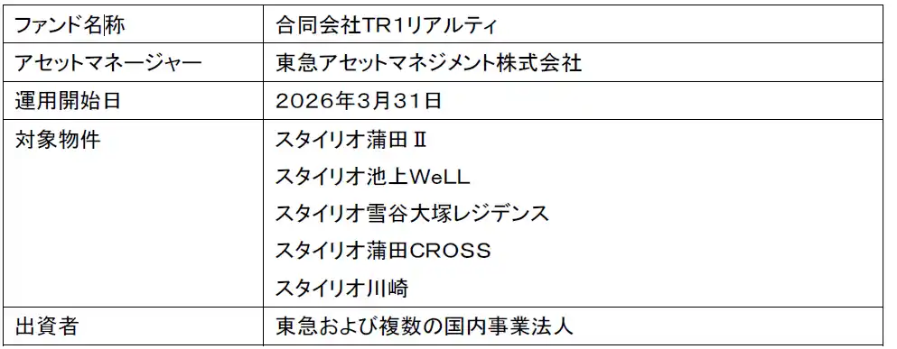 東急株式会社(以下、東急)および東急アセットマネジメント株式会社(以下、TAM)は、東急が東急線沿線を中心に展開する賃貸住宅ブランド「スタイリオ」シリーズの計5物件について、信託受益権化した上で、TAMが組成およびアセットマネジメント業務を受託する私募ファンド「合同会社TR1リアルティ」(以下、本ファンド)へ譲渡しました。本ファンドは、複数の国内事業法人を出資者として、2026年3月31日から運用を開始しています。 |