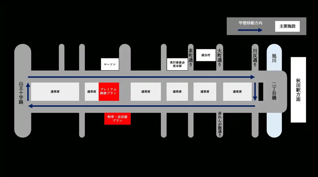 | 昨年の料亭・志田屋でのプレミアム観覧体験初実施以降、多くのお客様よりお問い合わせをいただいていた会場である竿燈大通り沿道での観覧ニーズに応える形で、より身近に竿燈演技を体感できる「プレミアム桝席プラン」が新たに加わります。 | ||||||||||||||