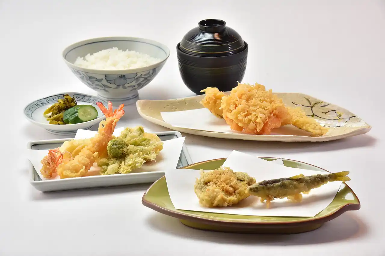 | 車海老、いか、魚介、野菜二品、蛤姿揚げ、口替り、穴子、かき揚げ、お揃い(ご飯、味噌汁、香の物) | |||||||||