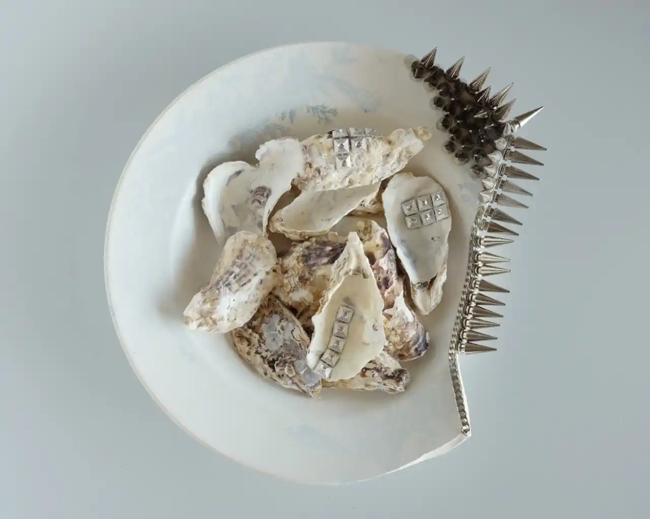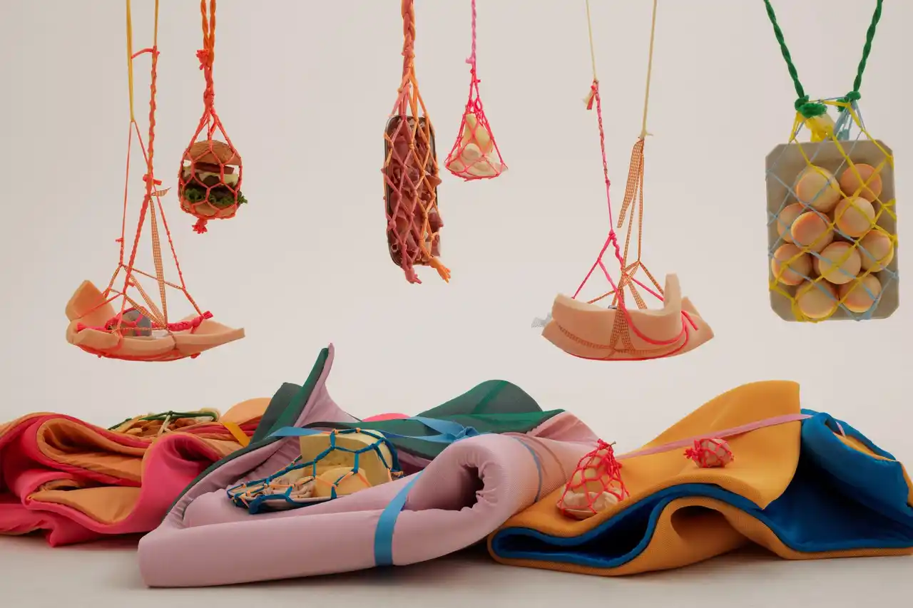 とかげ型のグミやメレンゲといった「食」と、スタッズを打ち込みラミネート・圧縮袋で変換したプロップ等の「非食」を融合させ、カテゴリー化された現代の価値観を揺さぶる装置として機能します。また、展示作品の一部を実際に試食できる体験もご用意しています。 |