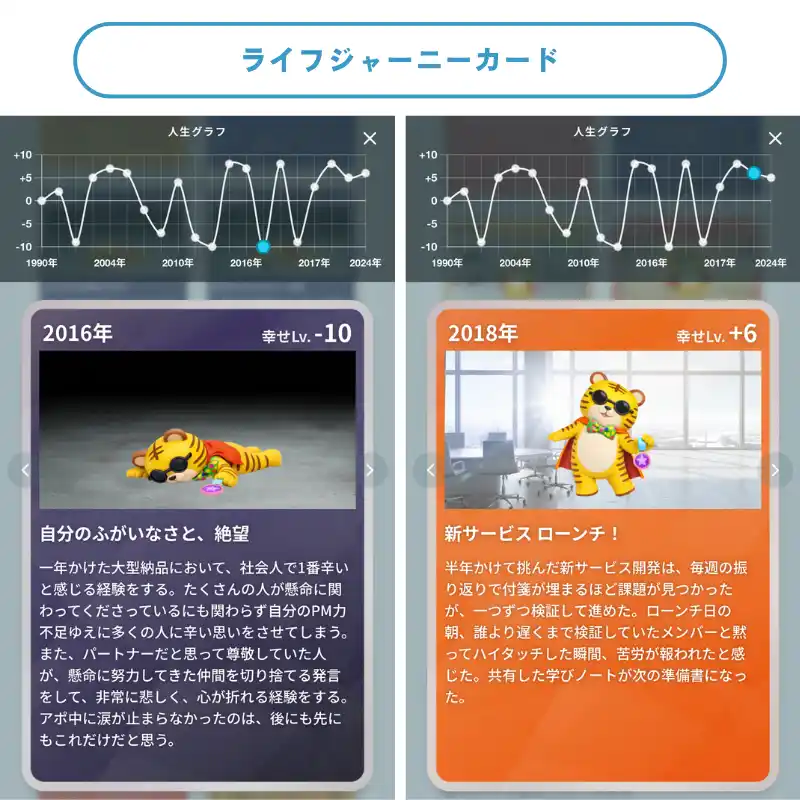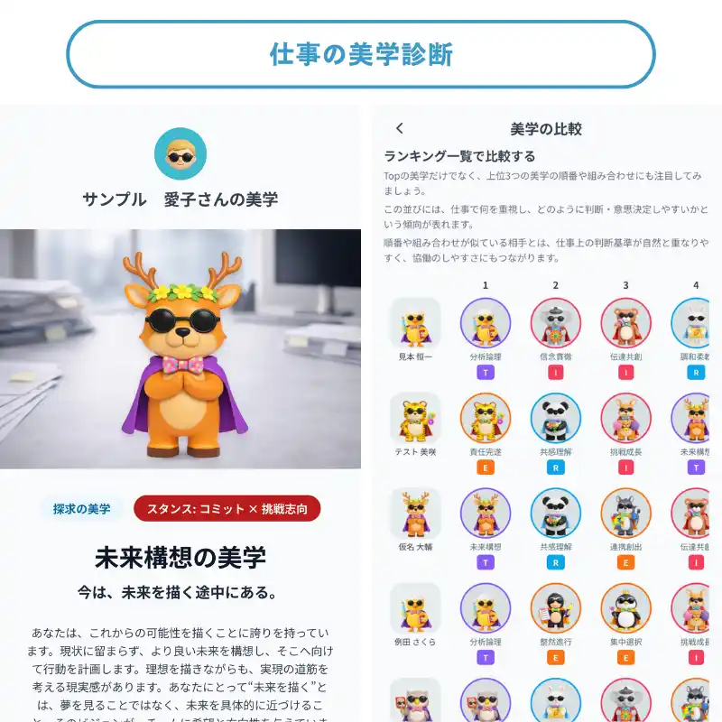 メンバー自身が、これまでの経験や価値観、これからのありたい姿を整理しやすいよう、自己理解を支援する機能を備えています。 「仕事の美学診断」では、まずはライトに仕事において大切にしている価値観を楽しみながら可視化。「ライフジャーニーカード」では、印象的な人生経験をカードにすることで、特許取得済のAIパーソナル分析機能が強みや価値観、モチベーションの源泉を整理し、自分らしさの理解を深めます。 |