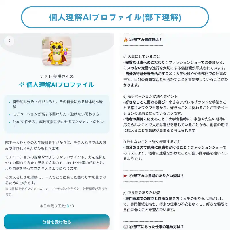 3万件以上の人生エピソードデータと2つの特許をもとに、メンバーの人生エピソードからAIが強み・価値観・モチベーションの源泉・関わり方のヒントを整理し、自己理解、相互理解、1on1や日々のマネジメントに活用できる仕組みを提供します。 |