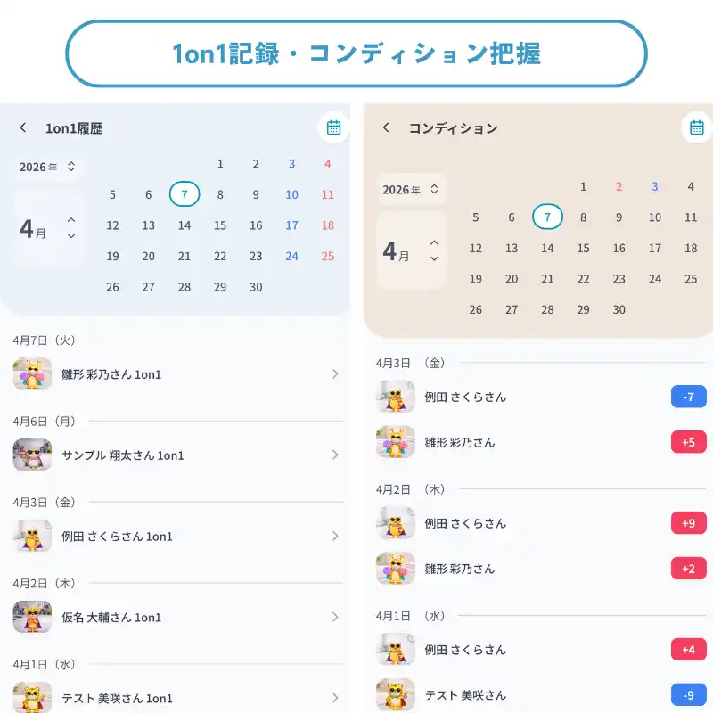 一人ひとりに合った関わり方を、単発で終わらせず、継続的なマネジメントに活かせます。 AIが生成する「個人理解AIプロファイル」により、マネージャーは各メンバーの強みや価値観、力を発揮しやすい関わり方を把握できます。さらに、「1on1記録」や日々のコンディション把握機能を通じて、対話や変化を継続的に蓄積。定期面談のタイミングで「ライフジャーニーカード」を更新することで、点ではなく線で成長を支援するマネジメントを実現します。 |