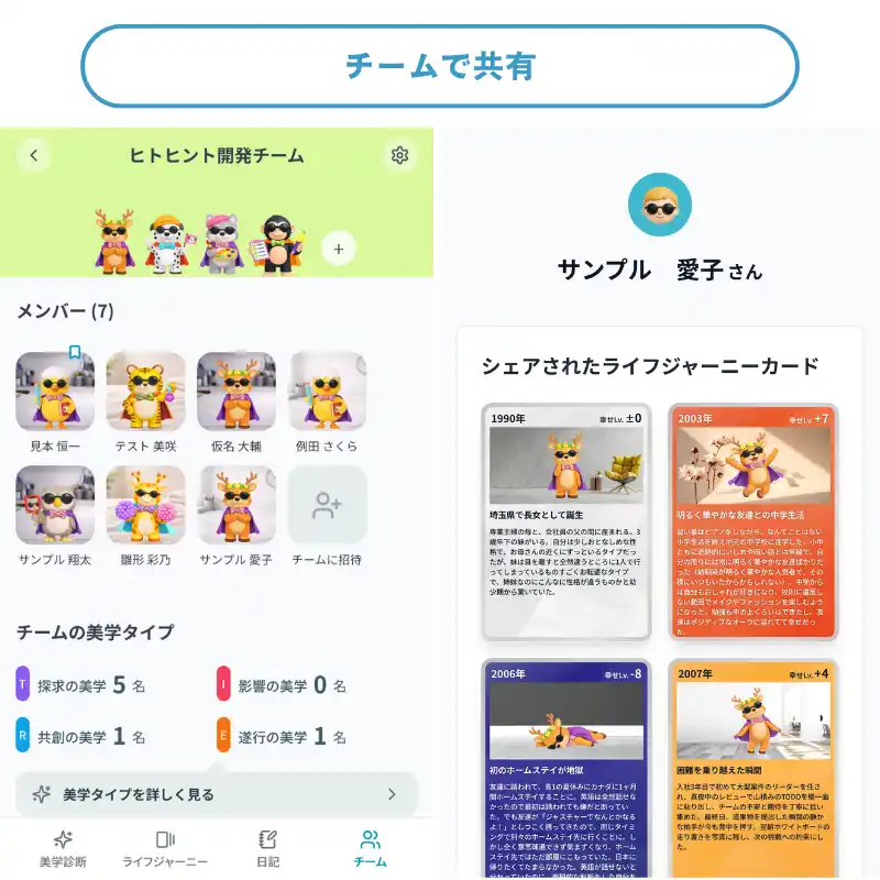 可視化された価値観や人生経験を、個人で終わらせず、チーム内の相互理解につなげられる設計です。 「仕事の美学診断」の結果や「ライフジャーニーカード」をチーム内で共有することで、メンバー同士や上司・部下間で、お互いの違いや背景を理解しやすくなります。 |