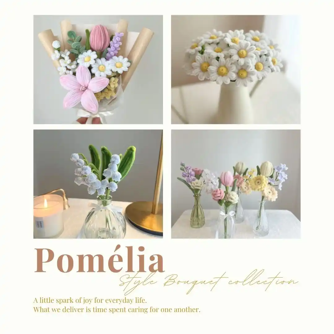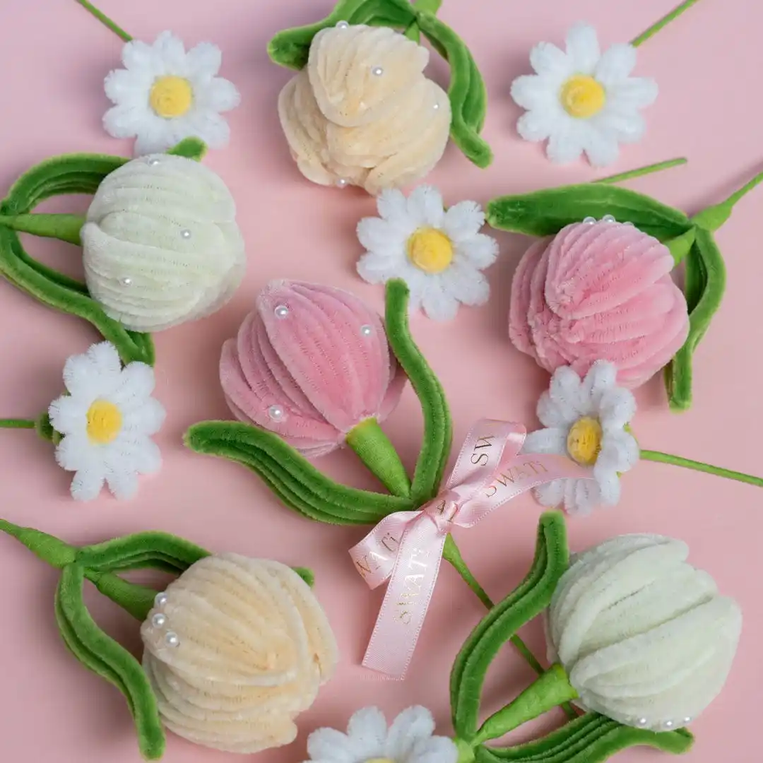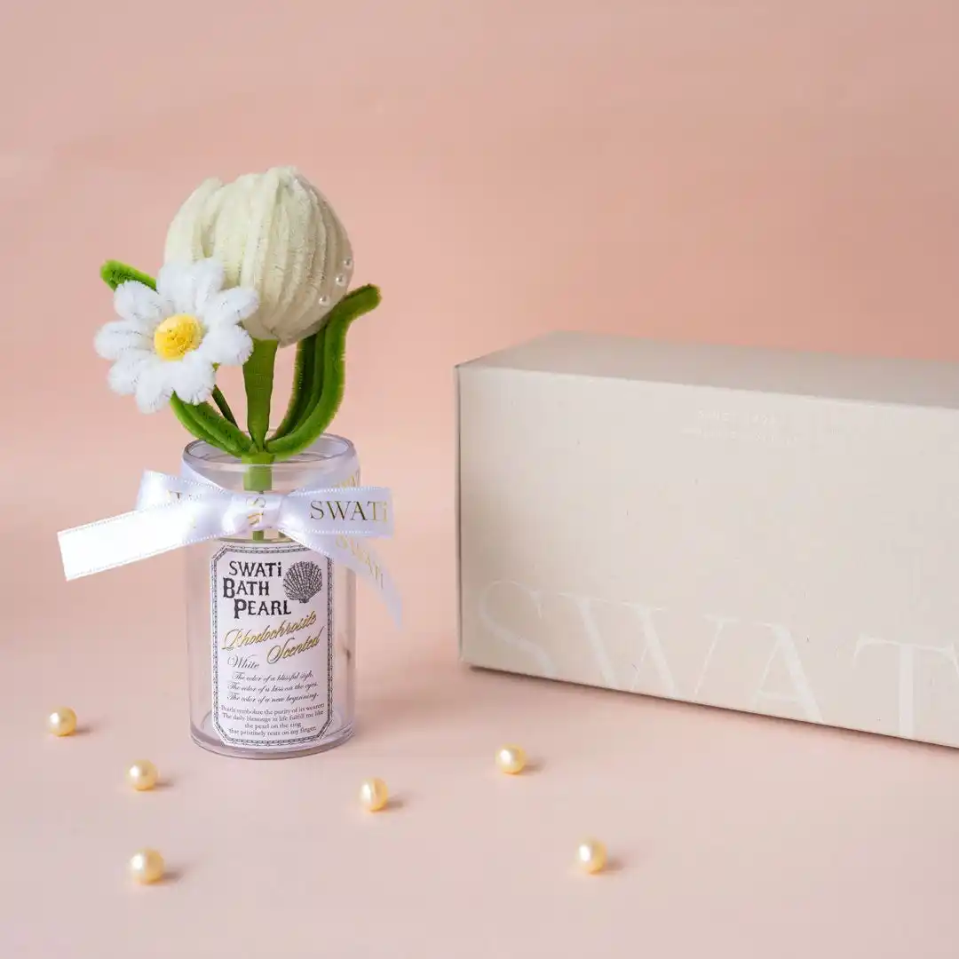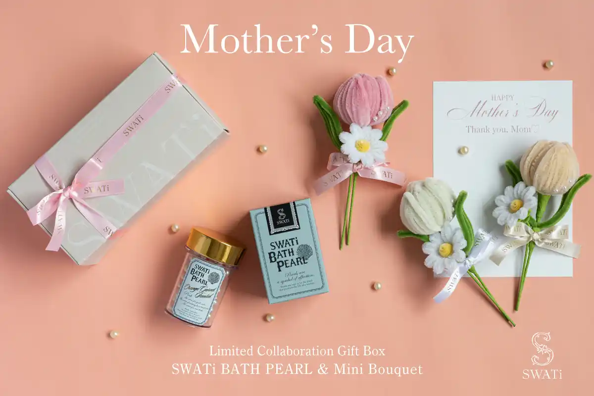 SWATi BATH PEARLに合わせて、Pomelia様にパール付きのモールフラワーをオーダーメイドで制作いただきました。思いやりを象徴するチューリップと、純粋な想いを表すデイジーを添えた、小さくても華やかなMini Bouquet。日頃のありがとうを、やわらかな想いとともに。 |