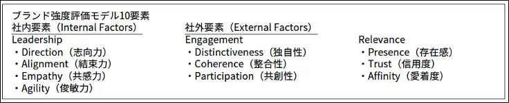 ブランド強度は、ブランドがロイヤルティを創出し、それによって将来にわたる持続可能な需要と利益を生み出す能力を測定します。ブランド強度の分析は、インターブランドが強いブランドを構成すると考える10の要素に基づく評価に基づいています。これらの領域におけるパフォーマンスは、業界内の他ブランドとの相対的な比較によって評価されます。ブランド強度分析は、ブランドの強みと弱みに関する洞察に満ちたスナップショットを提供し、将来に向けてブランドの強度と価値を高めるための活動ロードマップを作成するために使用されます。 |