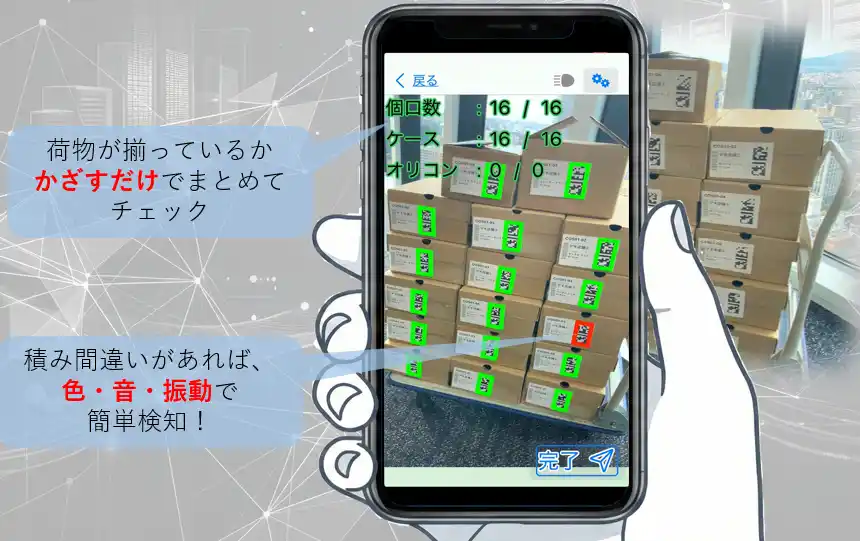 「ArU-cana」は、スマートフォンをかざすだけで荷物につけられたコードをまとめて認識し、荷物が揃っているか、積込対象外の荷物が紛れ込んでいないかを出荷データと照合してチェックできる、誤配送防止システムです。 |