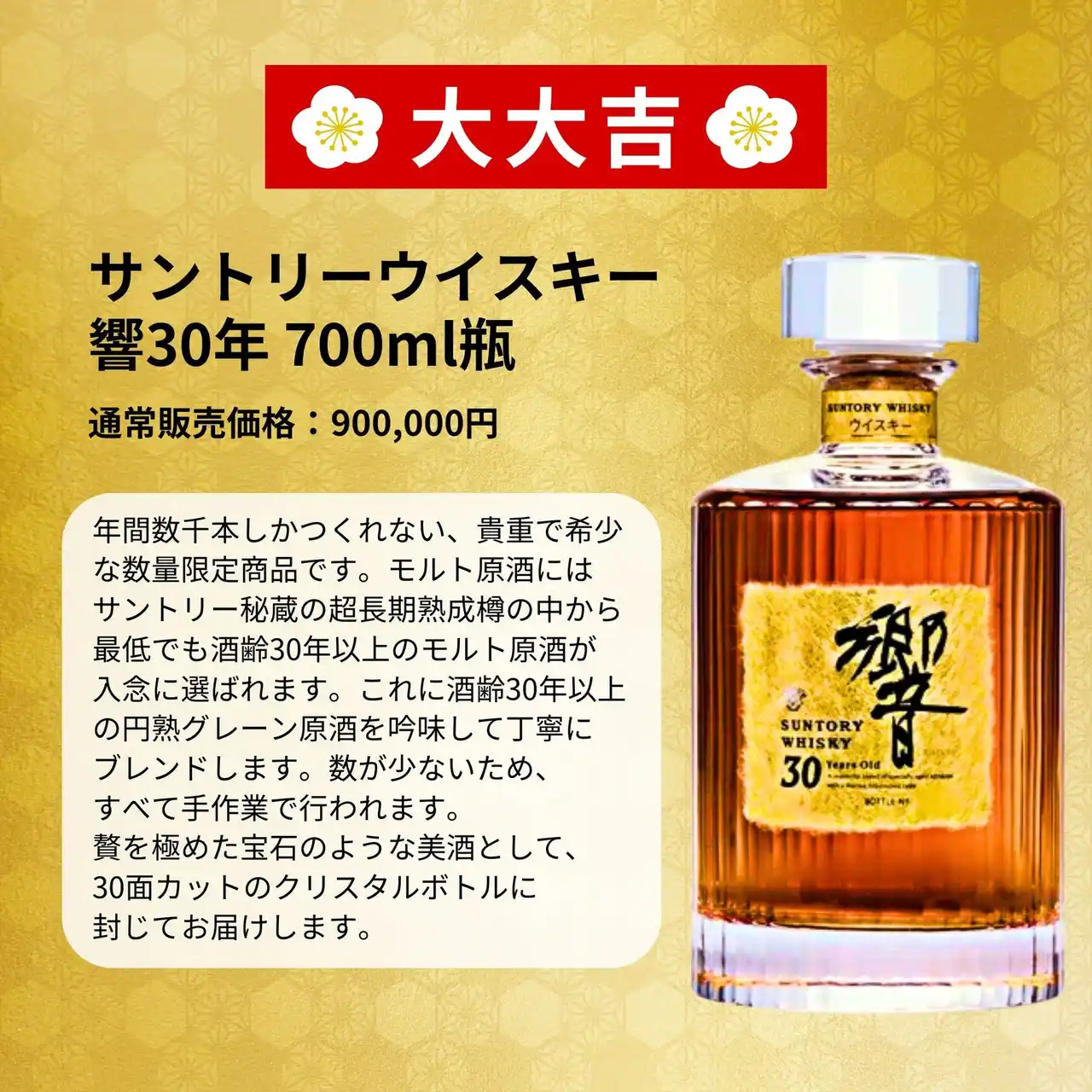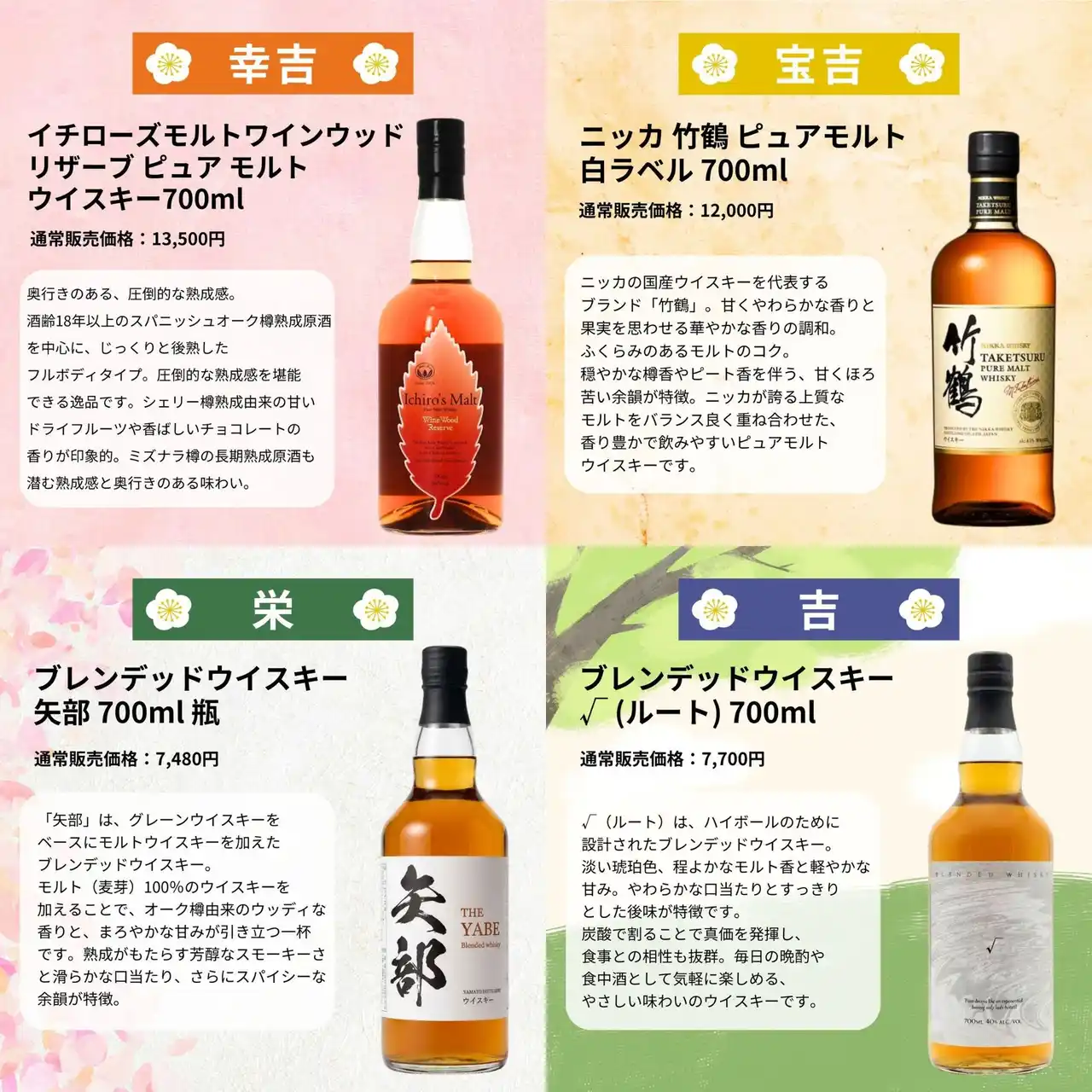 ・[超大吉×1]白州25年 ・[大大吉×1]響30年 ・[大吉×2]白州12年 ・[中吉×2]響 JAPANESE HARMONY ・[喜吉×3]白州シングルモルト ・[福吉×3]イチローズモルト&グレーン リミテッドエディション ・[緑吉×5]イチローズモルト ミズナラ・ウッド・リザーブ ・[幸吉×5]イチローズモルトワインウッドリザーブ ピュア モルト ・[宝吉×5]竹鶴 ピュアモルト 白ラベル ・[栄×90]ブレンデッドウイスキー矢部 ・[吉×349]ブレンデッドウイスキー √(ルート) |