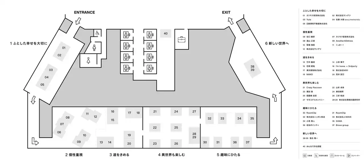 会場内は6つのゾーンに分かれ、40の部屋が配置されています。回遊しながら、自分なりの視点で「好きな部屋」を見つけていただけます。全40部屋のテーマについては特設サイト(https://subsclife.com/tokyorooms/exhibition)にてご確認ください。 |
