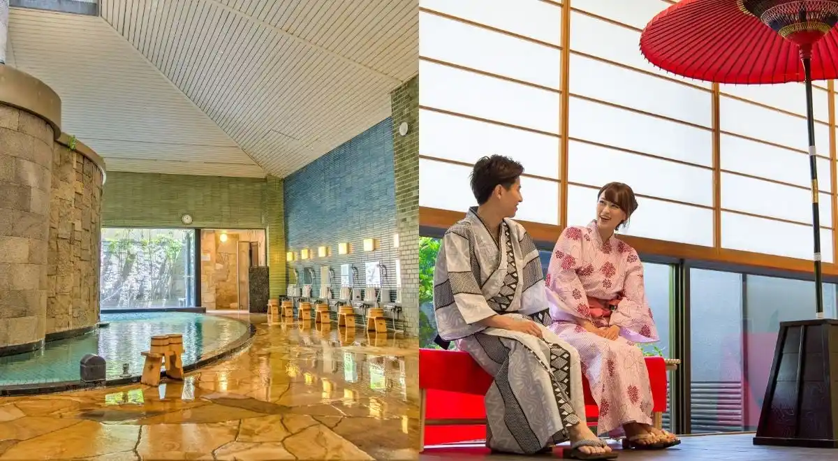 下田の天然温泉を、客室の露天風呂と大浴場で楽しむことができます。 |