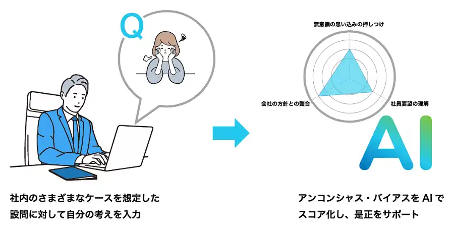 | といった観点でフィードバックを受けることで、自身の思考や発言の傾向に気づき、インクルーシブなコミュニケーションへの行動変容を促進します。 | |||
