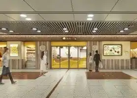 リニューアルの一環として、名古屋駅中央コンコースの店舗ファサードを一新します。ファサードには名古屋の伝統工芸「有松絞り」をモチーフに、幾何学の要素を取り入れたデザインを採用。絞り特有の凹凸が光を受けて生まれる陰影が、距離や視点によって異なる表情を見せます。 |