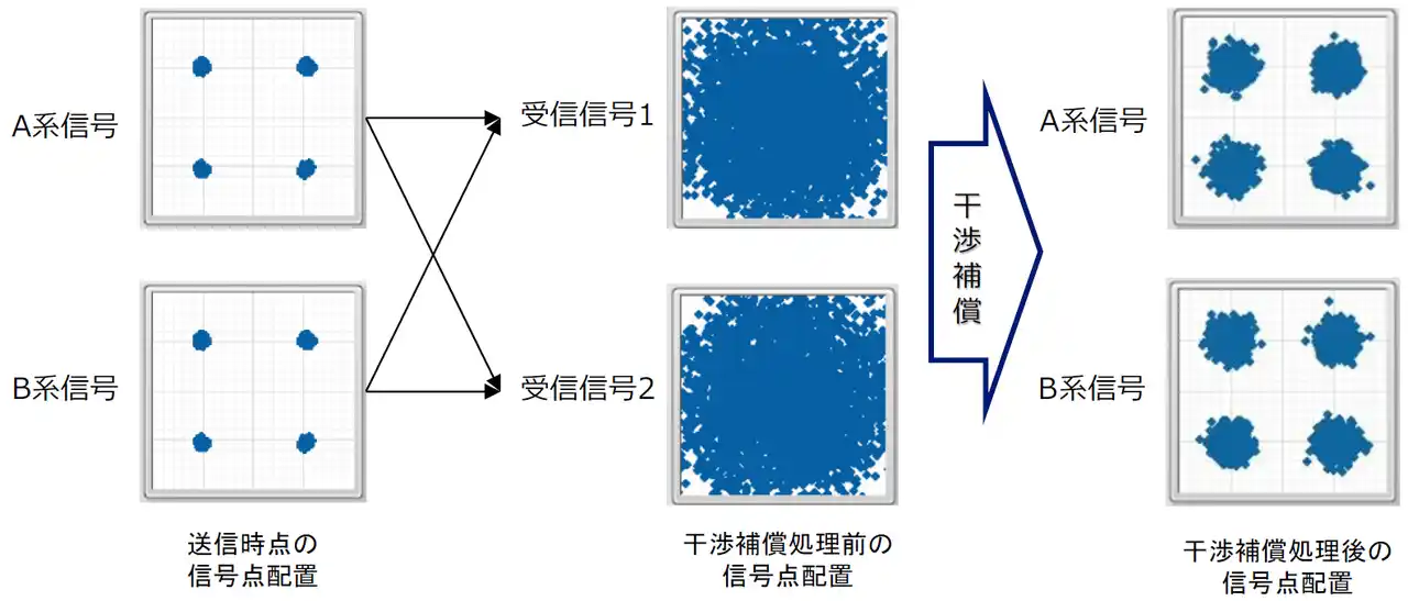 図2.MIMO信号処理による受信信号点の干渉補償の様子 ※信号点が4か所に収束している状態は、MIMO信号処理が想定通りに行われていることを意味します。 |