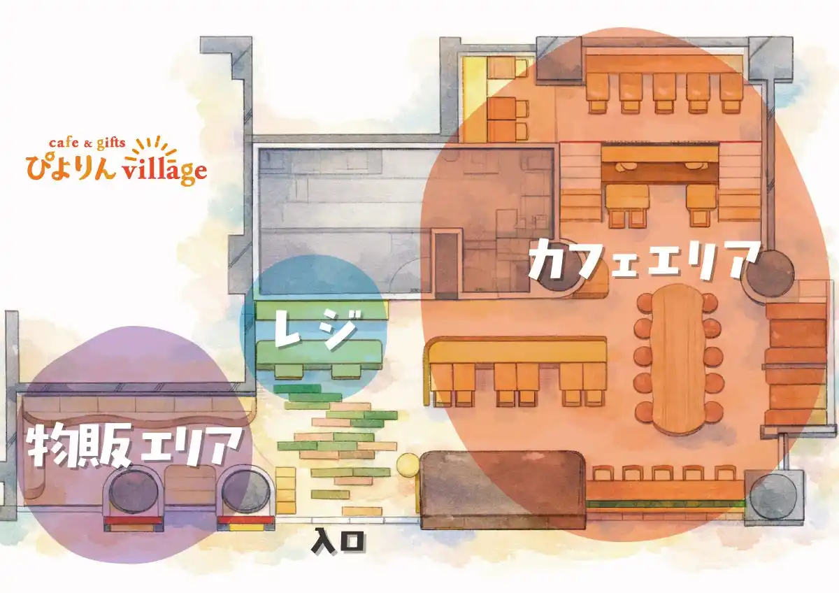カフェエリアは1階・2階の2フロア構成。店内には、ぴよりんvillageのストーリーをモチーフにした複数のゾーンを設け、ゾーンごとに異なる雰囲気や世界観を内装デザインで表現しています。 おひとり様でも、複数人でのご利用でも、どの席においても、ぴよりんの物語を感じられる空間となっています。 |