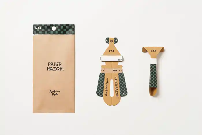 グローバル刃物メーカーの貝印と再びコラボレーションし、昨年も好評だったオリジナル「紙カミソリ(R)︎」を、エースホテル京都にご宿泊のゲスト限定で数量配布します。紙カミソリ(R)︎は、持ち手に紙、刃体部分に金属のみを使用した脱プラスチック製品として開発され、サステナブルな日用品として注目を集めています。 |