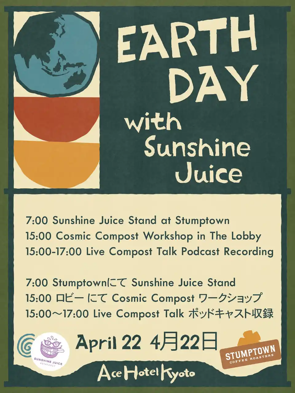 さらに今年は「Sunshine Juice(サンシャインジュース)」を迎え、新鮮なコールドプレスジュースをスタンプタウン・コーヒー・ロースターズにて提供します。また、ジュースやコーヒーの搾りかすを活用した「コンポストワークショップ」やポッドキャスト収録を実施いたします。 |