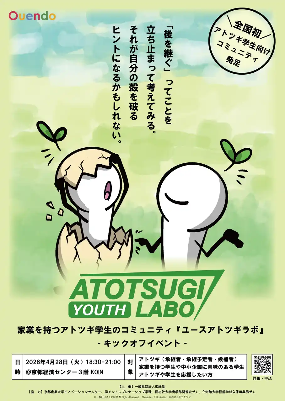 「人類みなアトツギを応縁する」をスローガンに掲げる一般社団法人応縁堂は、2024年3月に立ち上げた「アトツギラボ」に続き、2026年4月に家業をつ(中小企業の後継者となり得る)ユース世代の学生を中心としたコミュニティ「ユースアトツギラボ」を立ち上げます。 |