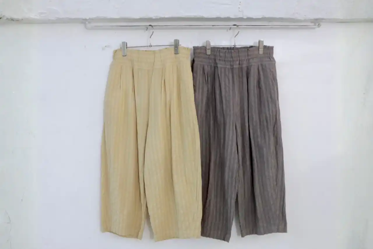 やわらかく落ち感のある風合いは、肌に心地よくなじみ、リラックス感のある穿き心地に。程よくゆとりを持たせたシルエットは、体のラインを拾いすぎず、すっきりとした印象に仕上げています。足首がのぞく軽やかな丈感は、トップスやシューズを選ばず、季節をまたいで活躍してくれます。 |