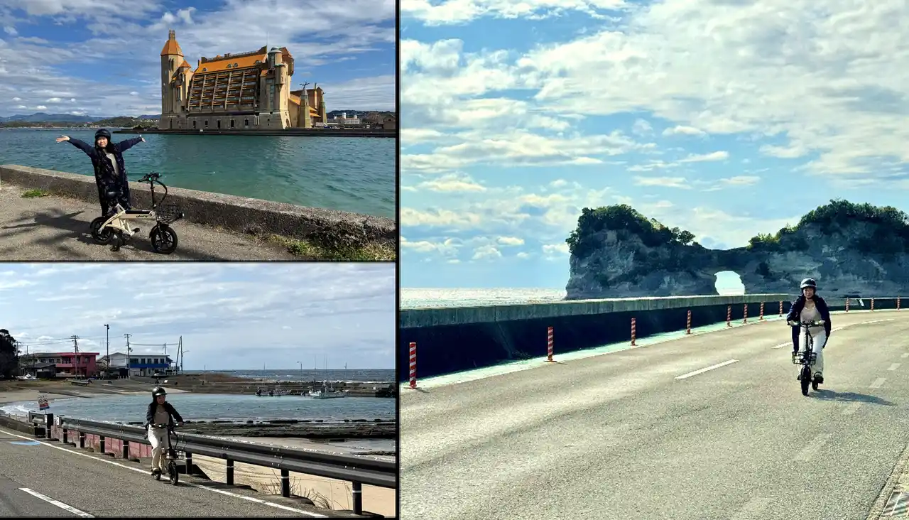 白浜町の北端にある江津良海岸方面まで、アイコニックなスポットをバックに海岸沿いを進みます。お城のようなラグジュアリーホテル「ホテル川久」を見つけたら、まずは記念撮影。思い立ったらふと車体を停めて記念撮影ができるのも、電動サイクルならではです。 |