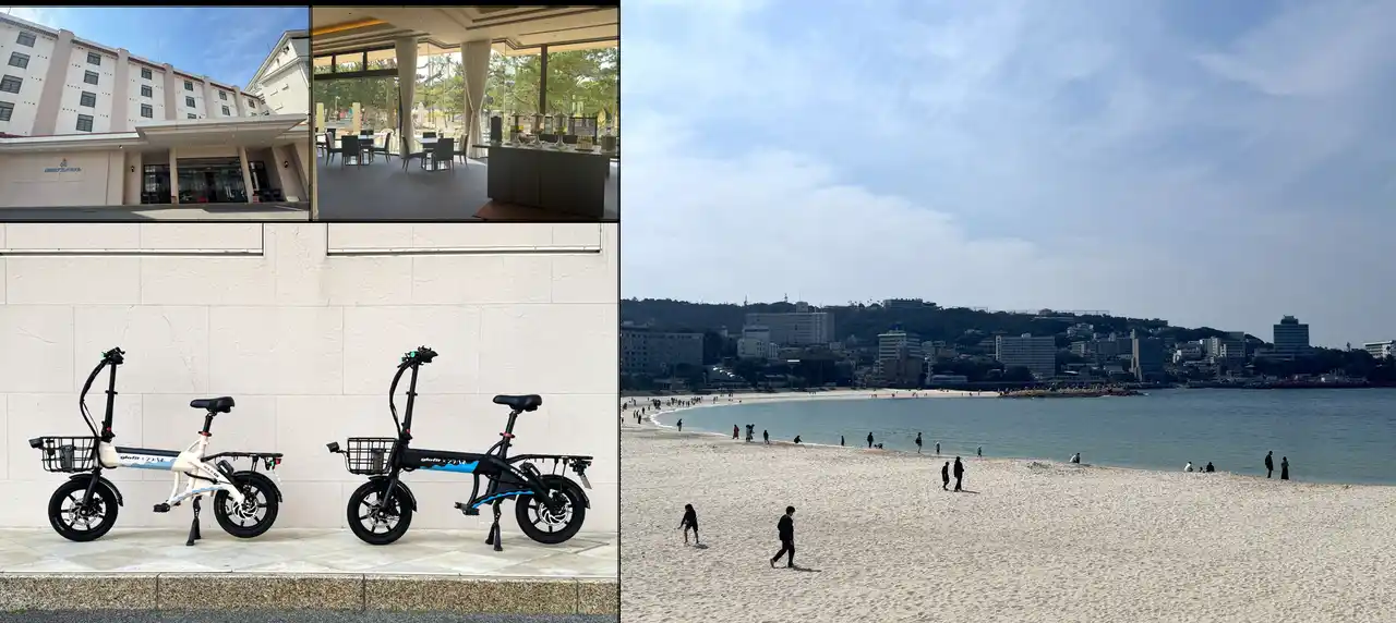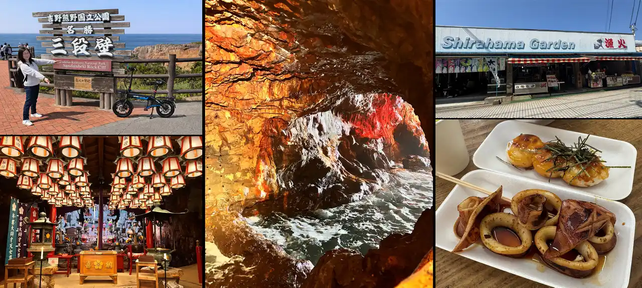 2つ目の拠点は、白良浜に隣接する白良荘グランドホテルです。白浜を代表する景観を目の前に出発し、足湯やカフェへの寄り道を楽しみながら、千畳敷や三段壁といった絶景スポットへ向かう王道ルートを提案します。白浜町オリジナルラッピングデザインの「NFR-01 Pro+」で走ることで、移動そのものが旅の高揚感を高める体験になります。 |