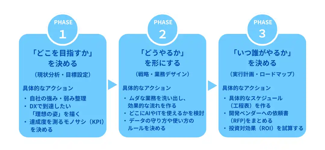 「DXに取り組みたいが、何から始めればいいかわからない」という経営者向けに、経営課題の整理から実行計画の策定まで、3つのステップで伴走します。 |