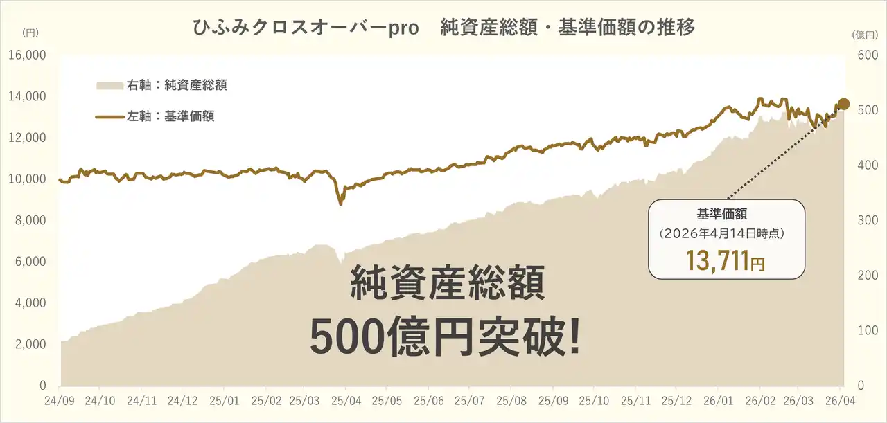 投資信託「ひふみ」シリーズを運用するSBIグループのレオス・キャピタルワークス株式会社(本社:東京都千代田区、代表取締役社長:藤野 英人、以下「当社」)は、2024年9月に運用を開始した未上場企業と上場企業に投資を行なう「ひふみクロスオーバーpro」の純資産総額が2026年4月8日、500億円を突破したことをお知らせいたします。新規株式公開(IPO)が期待される未上場企業に投資し、上場後も株式を持ち続ける「クロスオーバー投資」を行なう公募投資信託として、「ひふみクロスオーバーpro」は日本最大規模(※1)の純資産総額となります。2026年4月14日時点の基準価額は13,711円となりました。 |