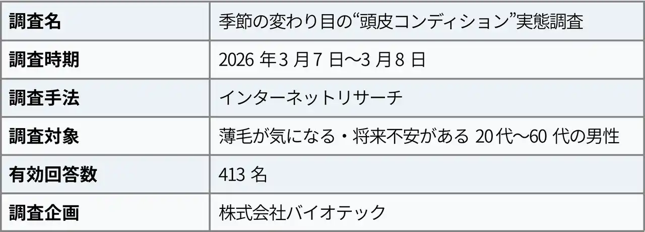 発毛・育毛の専門企業である株式会社バイオテック(本社:愛知県名古屋市)は、薄毛が気になる・将来不安がある20代~60代の男性413名を対象に「季節の変わり目の“頭皮コンディション”実態調査」を実施いたしました。 |