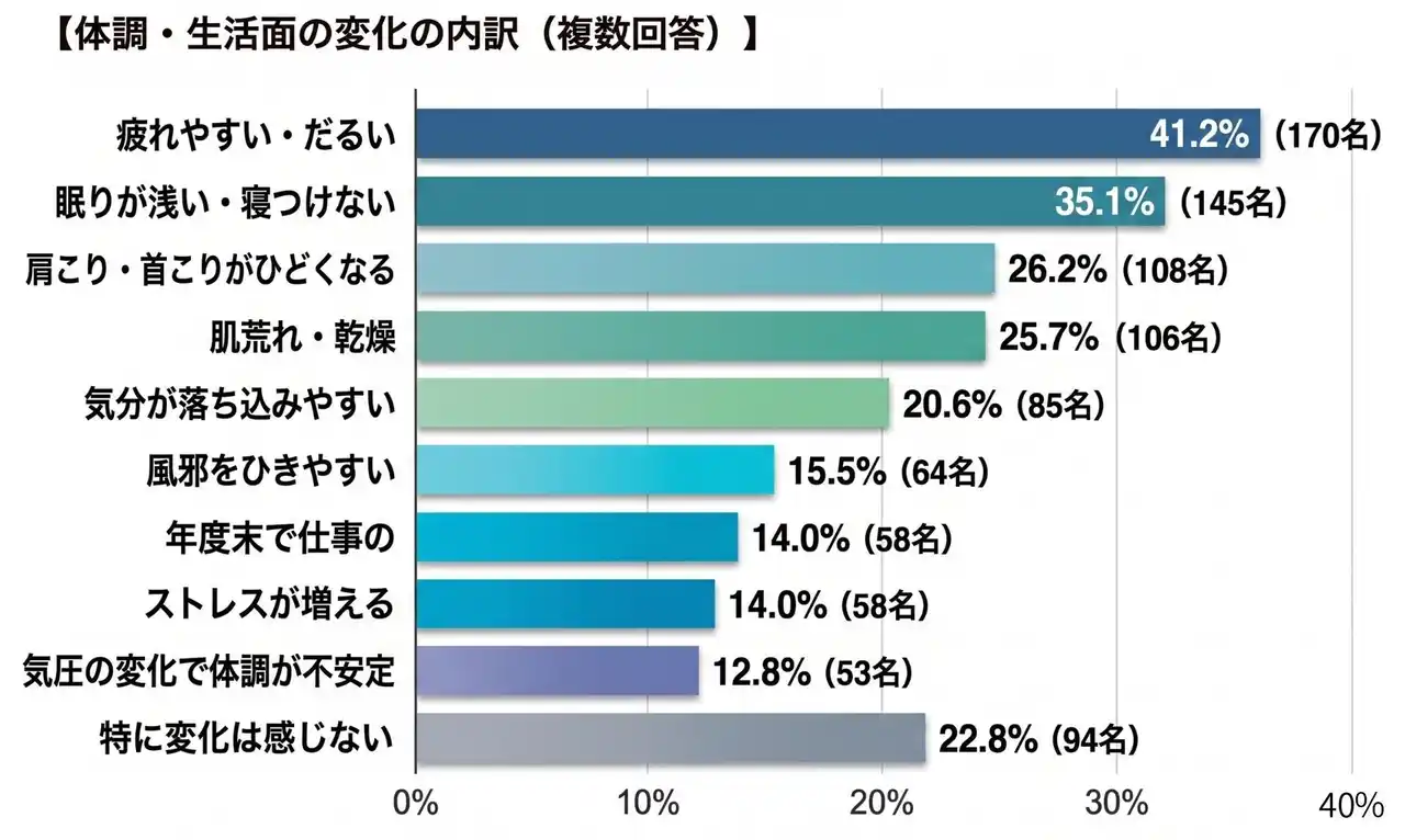 季節の変わり目に体調面で感じる変化を尋ねたところ、77.2%が何らかの体調変化を感じていると回答。頭皮と体調の両方で変化を感じている人は64.2%(265名)に達しました。 |