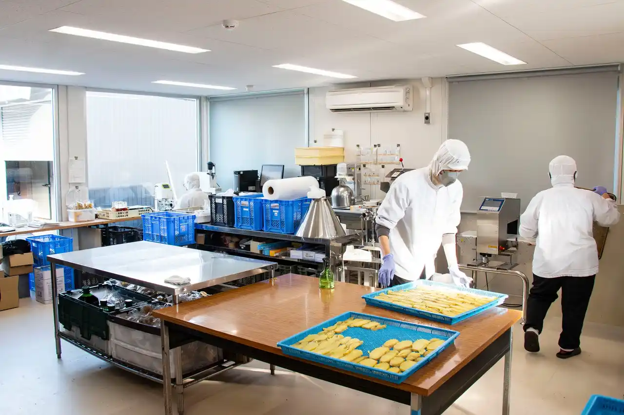 衛生環境が整った加工場で働く利用者の方々。お仕事の説明では、誇らしげに語る様子が印象的だった |