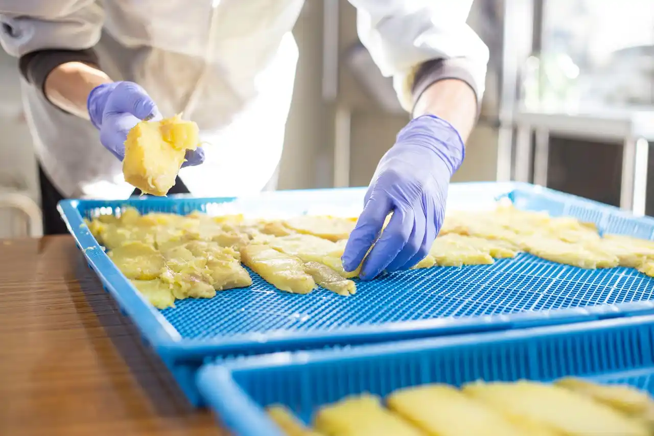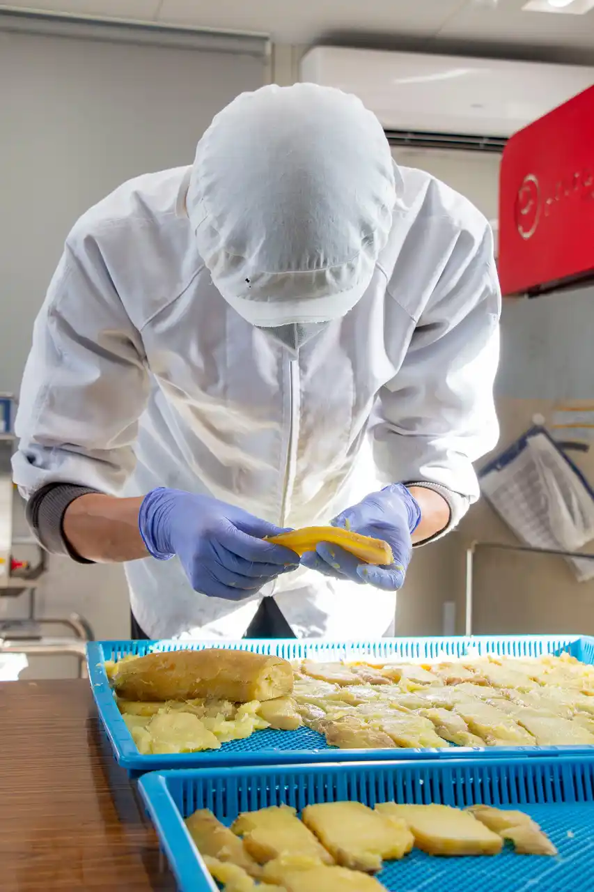 スライスされたさつまいもを一枚一枚ていねいにチェック |