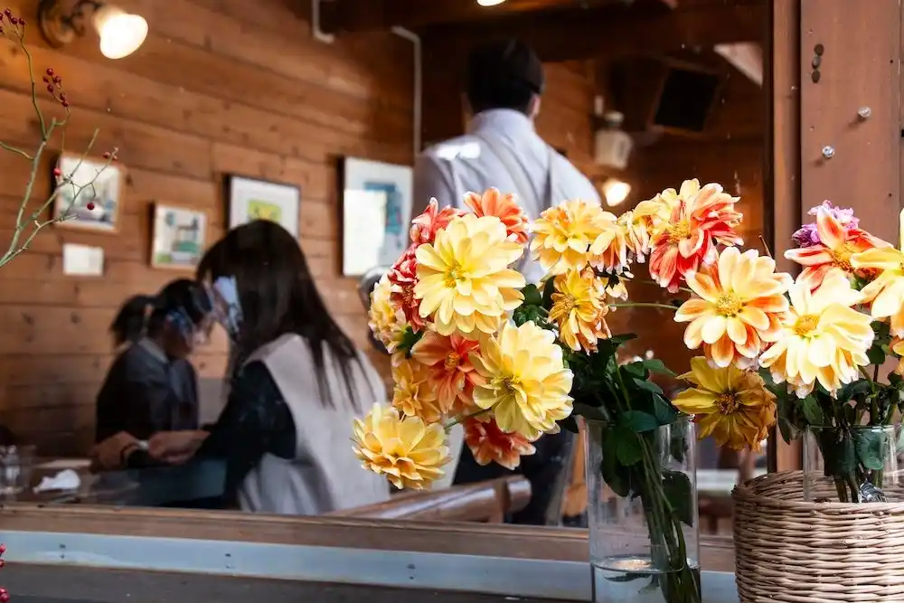カフェの各所には花が飾られており、その温かみを増している |