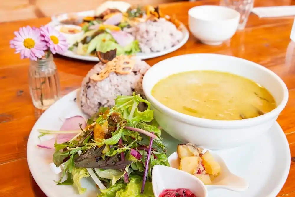 驚いたのがお料理のクオリティ。ご飯が進むメイン料理に栄養価の高い雑穀米、色鮮やかな野菜のサラダに、ていねいに味付けされた副菜の数々と、都心のカフェと比べても全く見劣りしません。 |