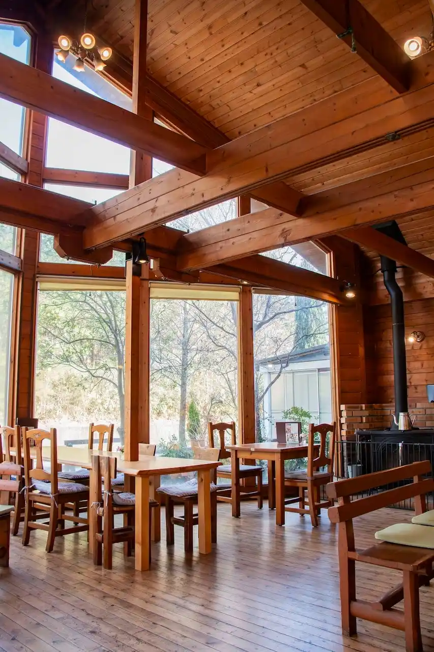 突き抜けるように高いカフェの店内。奥には煙突があり、炎のゆらめきが映える |