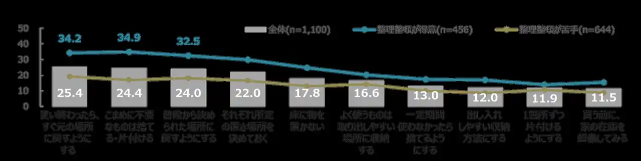 整理整頓が得意な人は、「使い終わったら、すぐ元の場所に戻すようにする」「こまめに不要なものは捨てる・片付ける」「普段から決められた場所に戻すようにする」が3割を超える。<図5> |