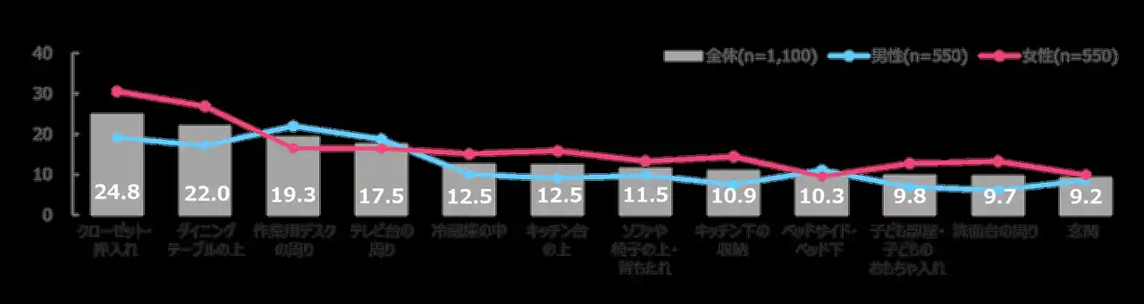 家の中でよく散らかる場所は「クローゼット・押入れ」「ダイニングテーブルの上」「作業用デスクの周り」が上位。 |