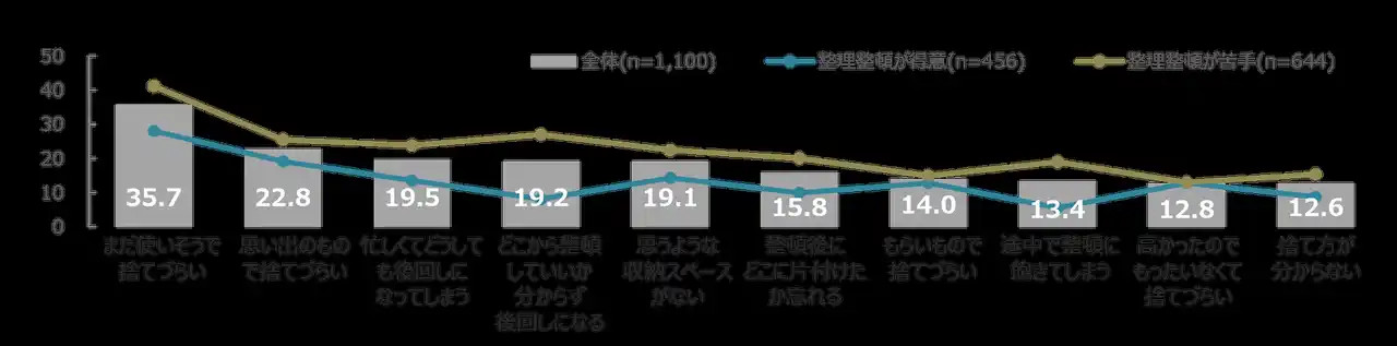 整理整頓に苦手意識がある人は、「まだ使いそうで捨てづらい」「どこから整頓していいか分からず後回しになる」「途中で整頓に飽きてしまう」が高い。<図4> |