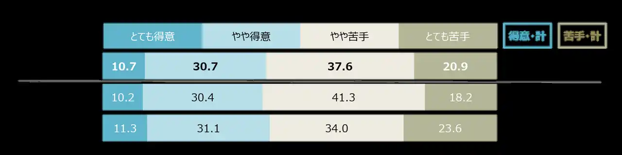男女ともに「得意」が4割、「苦手」が6割で、男女差は見られない。<図1> |