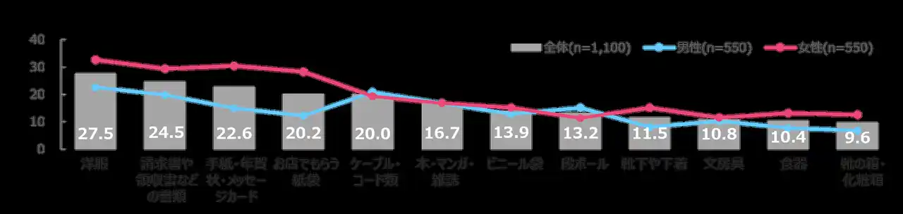上位3項目に加え、「お店でもらう紙袋」は女性の方が捨てづらいと感じていて、男女差が顕著。<図3> |