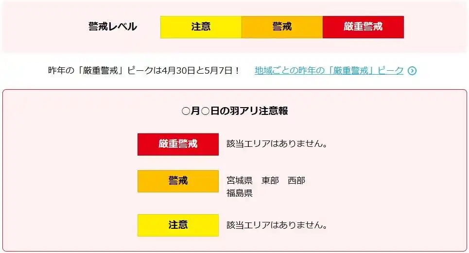 ■昨年の発生ピークを振り返る:昨年3,000件超のプロット地点や、地域別の警戒レベル発表実績(昨年は4月30日、5月7日がピーク)を網羅しています。 |