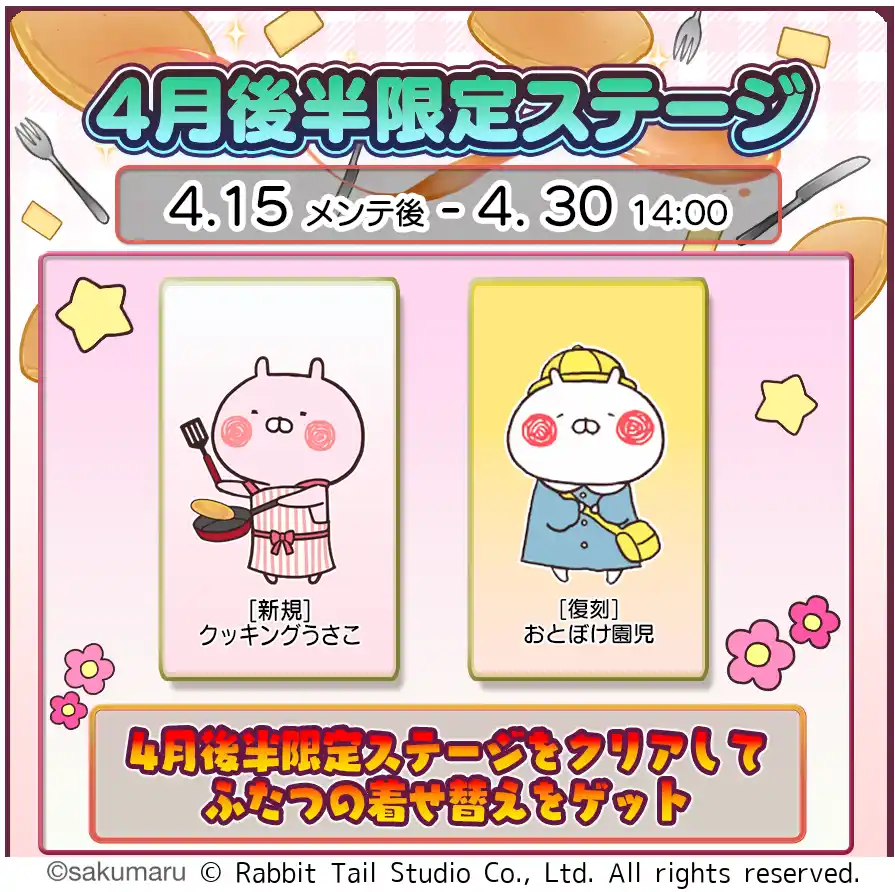対象ステージクリアで、[新規]クッキングうさこ、[復刻] おとぼけ園児の着せ替えがゲットできます! |
