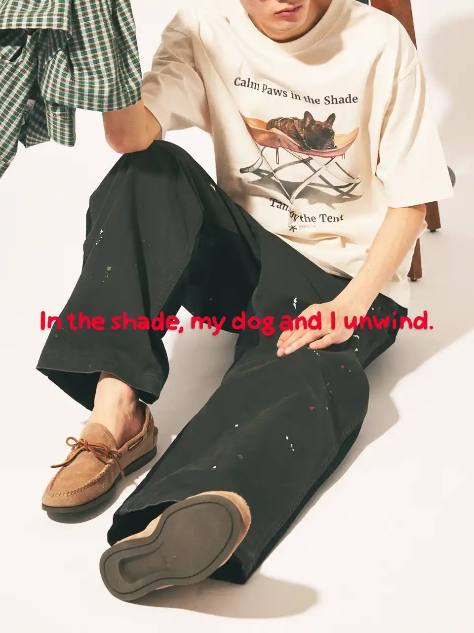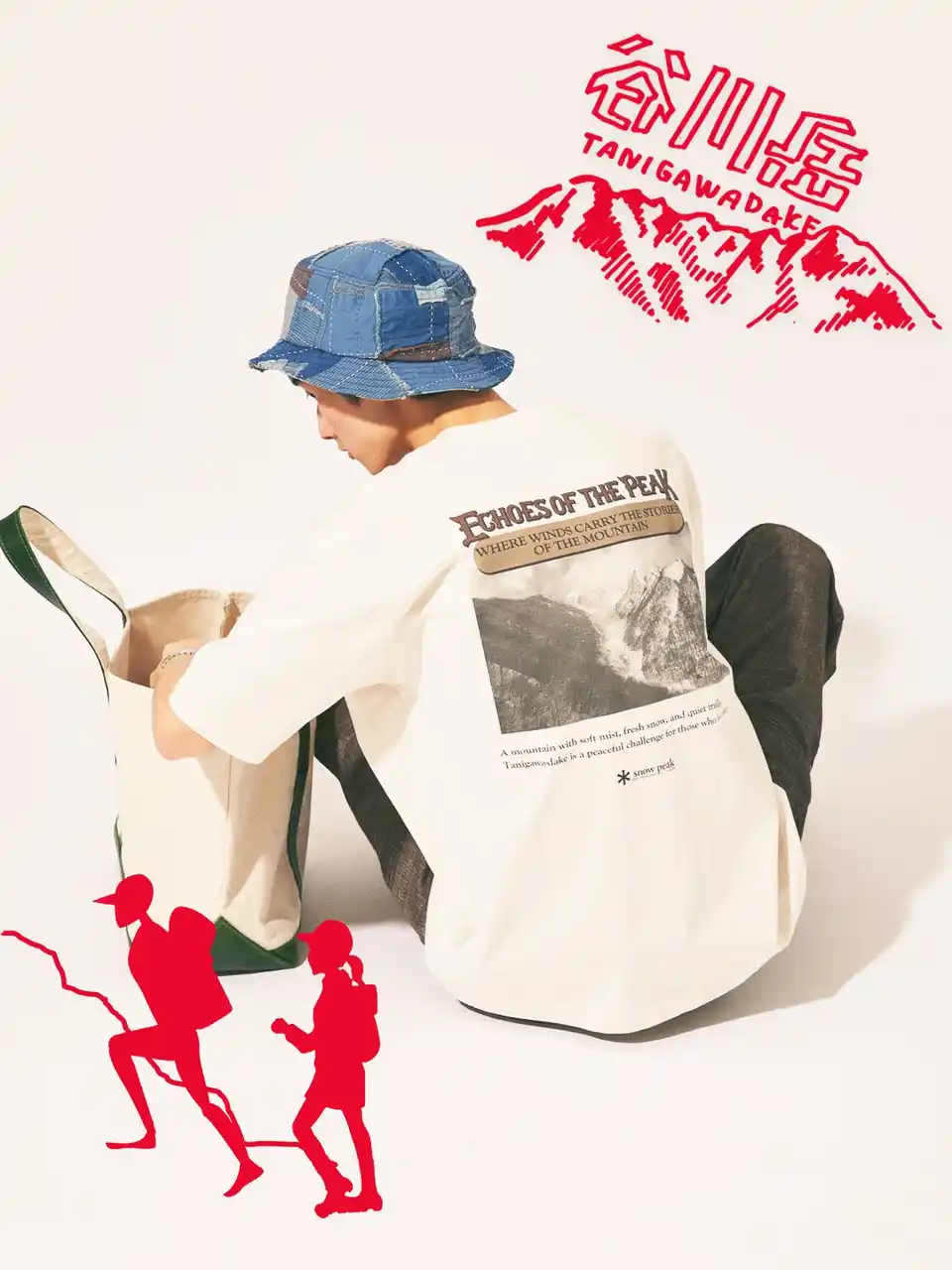 JS別注となる本コレクションでは、谷川岳やキャンプギアなど、“SNOW PEAK”のフィールドやプロダクトから着想を得たグラフィックを採用。真っすぐなアウトドアの空気感の中に、休憩中の犬たちを描いたどこか余白を感じさせるモチーフを落とし込み、全体の緊張感をやわらかく和らげるプレイフルなシリーズに仕上げている。 |