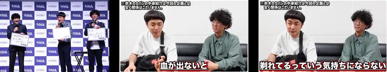 今回、新TVCM・WebCMに出演した声優・俳優の津田健次郎さんに加え、芸人のたくろう(赤木裕さん・きむらバンドさん)が登壇。津田さんはたくろうさんに対して、「ネタを何個見たことがあるかわからないくらい好きです!」と告白し、会場が盛り上がる中で、「普段からSchick(シック)製品を持ち歩いているが、正しいシェービング前後の肌ケアを知らない」という、たくろうのお二人を交え、シェービングにまつわる肌ケアクイズ対決を実施しました。 |
